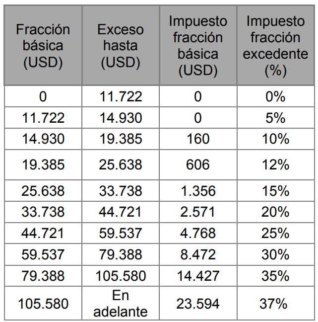 Para calcular el impuesto a la renta se restará, de la totalidad de los ingresos gravados, las devoluciones, descuentos, costos, gastos y deducciones atribuibles a esos ingresos. A este resultado se debe aplicar la tabla que se detalla a continuación: