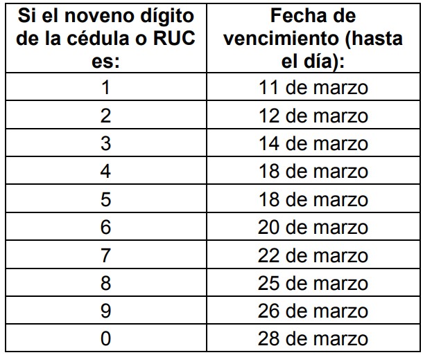 El Impuesto a la renta de personas naturales sujetas al régimen general y al régimen RIMPE emprendedor se liquidará y pagará hasta marzo de 2024, de acuerdo con las siguientes fechas de vencimiento: