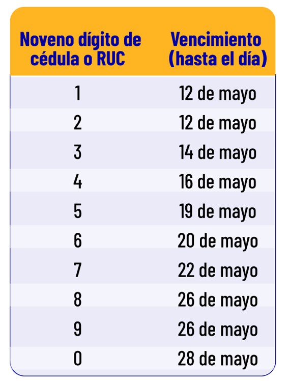 Las personas naturales que pertenecen al régimen RIMPE deberán declarar y pagar su Impuesto a la Renta, según el siguiente calendario: