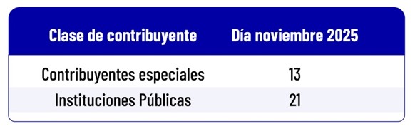 La resolución también establece que, de manera excepcional, las instituciones del Estado, las empresas públicas reguladas por la Ley Orgánica de Empresas Públicas y los contribuyentes especiales, podrán presentar las declaraciones del IVA y Retenciones del mes de septiembre de 2025 hasta noviembre de 2025 (sin que esto cause multas, recargos ni intereses) conforme la siguiente tabla: